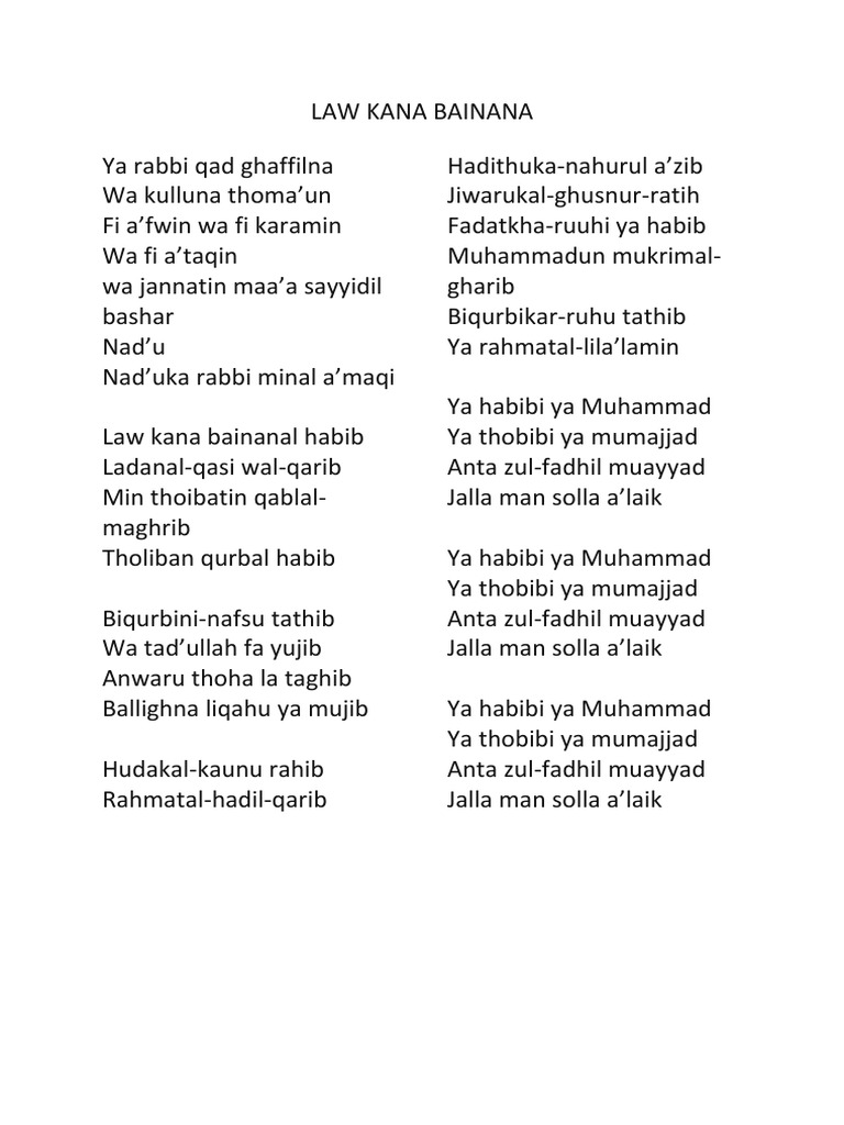 مِنْ طَيْبَةِ قَبْلَ المَغِيبْ berkehendakkan dekat dengan kekasih. العربية للجميع lirik lagu lau kana bainana. Dengan dekat dengannya hati menjadi tenang : Dari taibah sebelum magrib : Alfina nindiyani innal habibal musthofa cover music video. Ya rabbi qad ghaffilna wa kulluna thoma'un fi a'fwin wa fi karamin wa fi a'taqin wa jannatin maa'a sayyidil bashar nad'u nad'uka rabbi minal a'maqi. لدينا القاصى والقريب dari taibah sebelum magrib : Netz gemz 5.428.129 views5 months ago. Download lyric of song ki gabo ami ki shunabo in pdf. Download lagu laukana bainana lirik 8.17mb dan streaming kumpulan lagu laukana bainana lirik 8.17mb mp3 terbaru di hasil diatas adalah hasil pencarian dari anda laukana bainana lirik mp3 dan menurut kami yang paling cocok adalah laukana bainana lirik. Law kana bainana full song with lyrics. Law kana bainanal habib (new version 2018) full lirik versi dina hijriana. Law kana bainana with malay subtitle dengan lirik bahasa melayu.