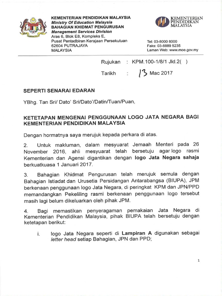Jul 15, 2020 · penggunaan jata dalam logo kementerian pendidikan malaysia (kpm) telahpun diputuskan dalam mesyuarat jemaah menteri pada november 2016 dan berkuat kuasa pada januari 2017. See full list on moe.gov.my Chief information officer (cio) vision and mission. Ketetapan mengenai penggunaan logo jata negara bagi kementerian pendidikan. Surat yang bertarikh 13 mac 2017 itu menetapkan logo rasmi kementerian dan agensi kerajaan digantikan dengan logo jata negara sahaja berkuatkuasa 1 jnauari 2017.